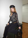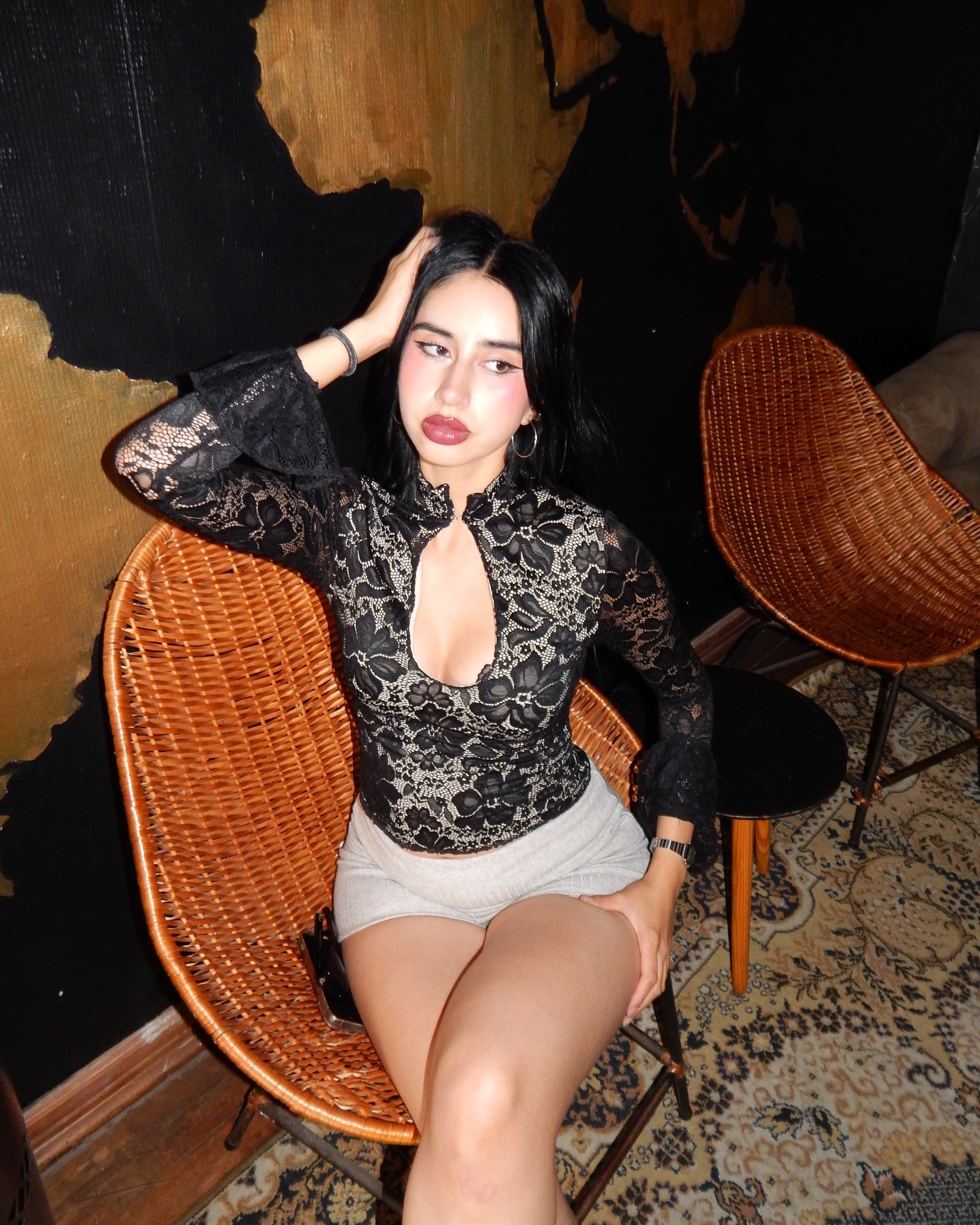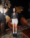 Romántico, elegante y sensual. El Condesa Top destaca por su encaje delicado, cuello mao y escote sutil que realza el busto. Su silueta ajustada estiliza la figura, mientras las mangas amplias aportan movimiento y sofisticación.