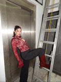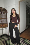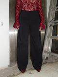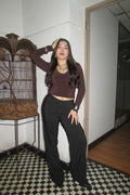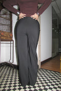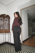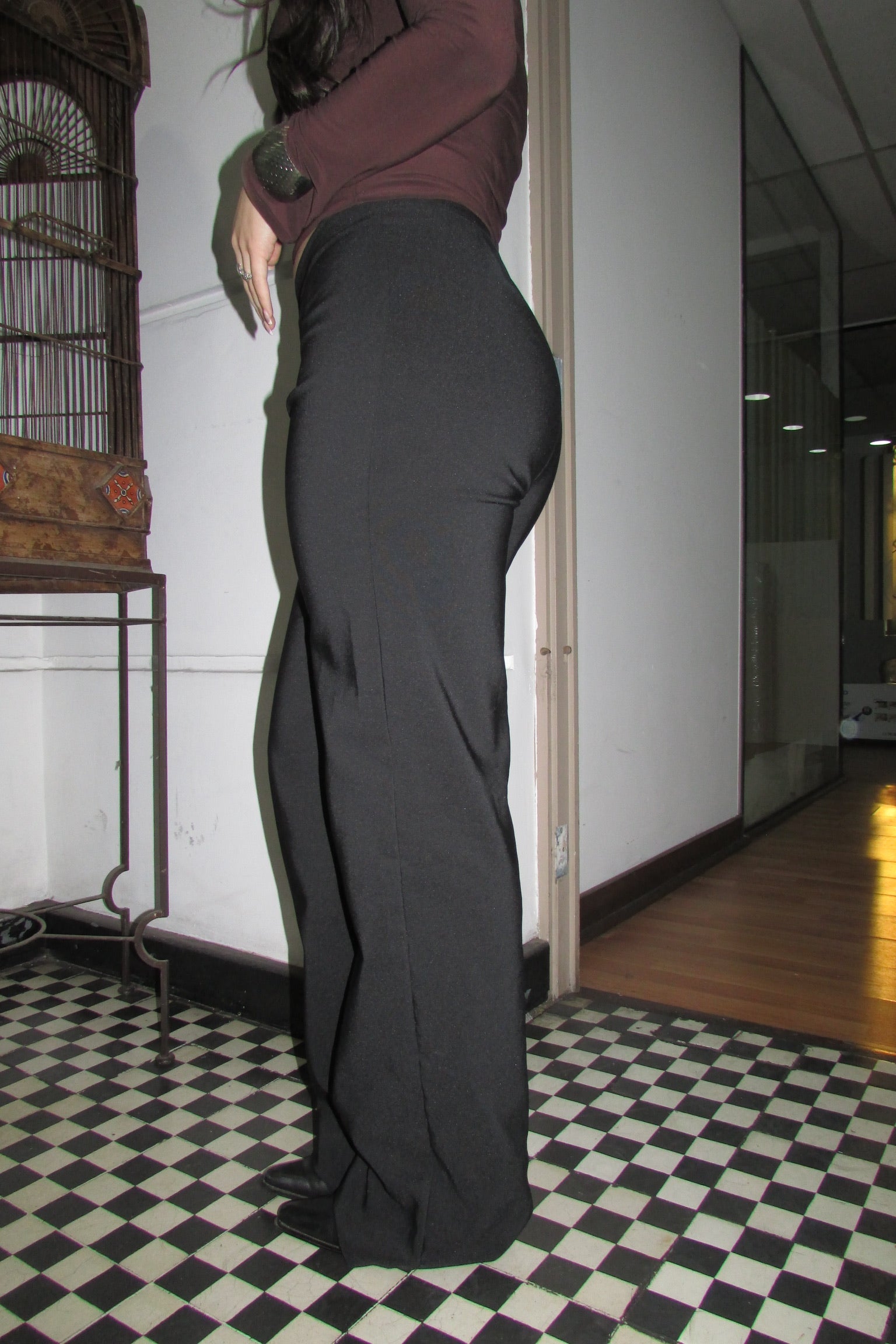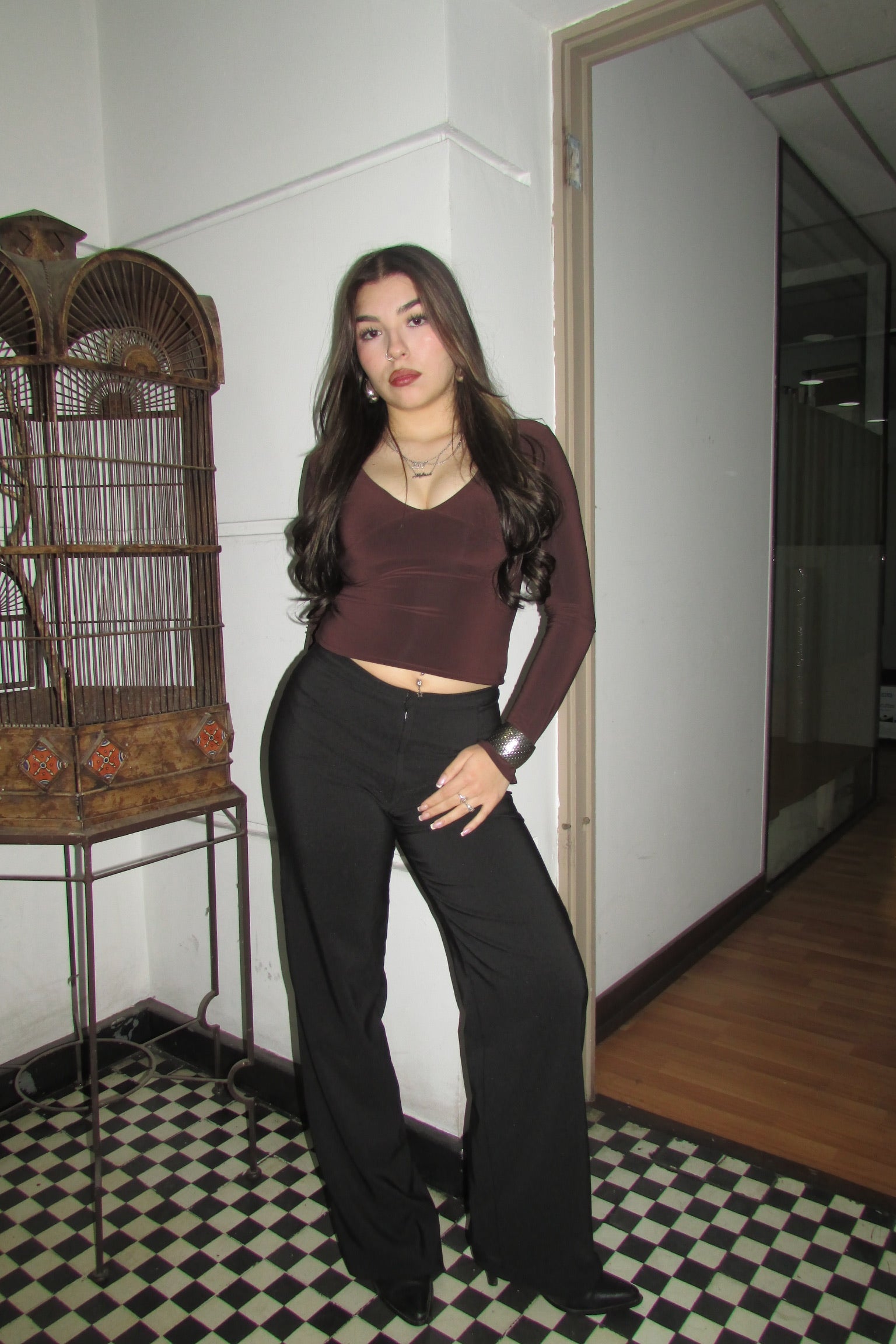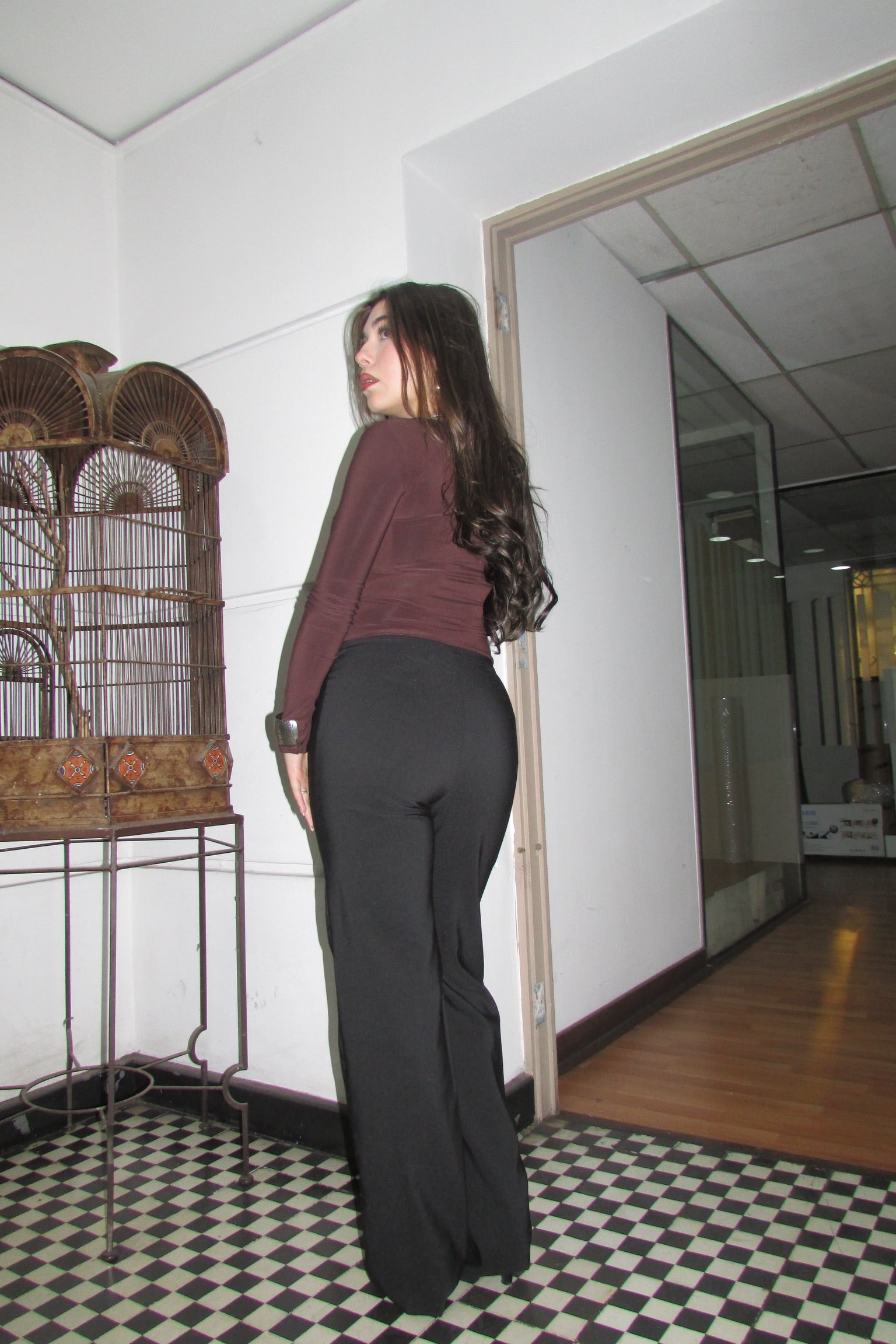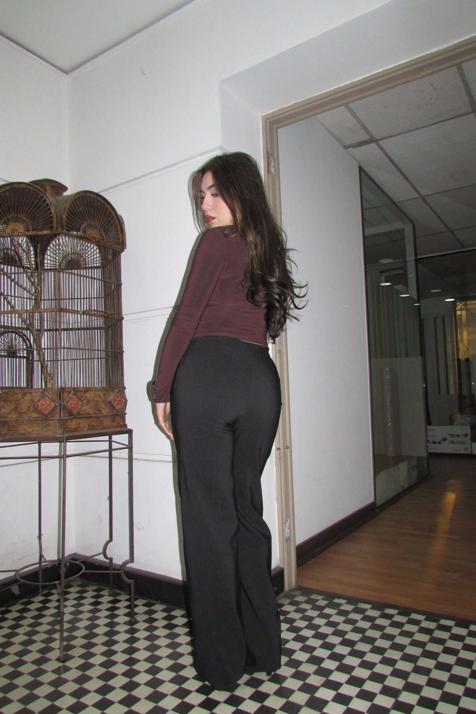 Pantalón sastrero de tiro medio, confeccionado en tela semi elasticada que brinda comodidad y estructura. Diseño con pretina delgada, cierre frontal y broche interno para un acabado limpio. Calce ajustado en cadera y muslo alto, con una caída recta y amplia que estiliza la figura hasta la bota. Ideal para un look elegante y versátil.